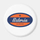 Oval signage design featuring the neighbourhoods of New York City. Official orange and blue colours of NYC. Astoria neighbourhood of Queens.