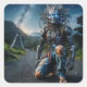 A humanoid robot with luminous blue eyes kneels on a path leading to an ancient temple, blending technology with historical architecture. The robot's intricate design and exposed circuitry contrast strikingly with the natural backdrop of the landscape. Evening stars twinkle softly in the sky, enhancing the scene's mystical atmosphere.