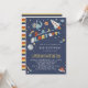 Cool space-themed birthday party invitation featuring a sloth astronaut floating among shooting stars, planets, and spaceships!
