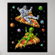 This funny cosmic design features a space astronaut and an alien riding a pizza slice.