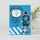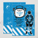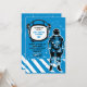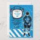 A realistic, grunge invitation featuring an astronaut and a helmet "frame" to emphasize your child's name and age. The card is easy to customise with your wording, font, font colour and choice of six paper types.