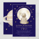 Blast off to a cosmic celebration with this charming astronaut-themed invitation! Featuring a sweet watercolor illustration of a young astronaut gazing at the moon, surrounded by twinkling stars, this design is perfect for a second birthday party. The deep navy blue background evokes the wonder of outer space, making it an out-of-this-world choice for your little one's special day. Customize with your party details to invite guests on an unforgettable journey to celebrate two years of adventure.