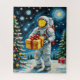 This vibrant design features an astronaut in a full space suit holding a golden gift box, set against a whimsical backdrop of a starry night sky and a festive Christmas tree. The contrast between the vastness of space and the warmth of holiday traditions makes this image both captivating and heartwarming.