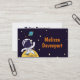 Business cards with a dark blue background with yellow stars scattered around. Layered over top is an illustration of a spaceman wearing a white astronaut suit floating above the moon. Waving hello as he explores space. Off in the distance is a planet with rings.