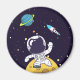 A magnet with a dark blue background with yellow stars scattered around. Layered over top is an illustration of a spaceman wearing a white astronaut suit floating above the moon. Off in the distance is a planet with rings and a rocket ship flying off into the sky looking for new worlds to explore.