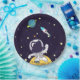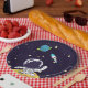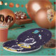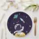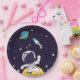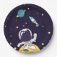 Paper napkins with a dark blue background with yellow stars scattered around. Layered over top is an illustration of a spaceman wearing a white astronaut suit floating above the moon. Waving hello as he explores space. Off in the distance is a planet with rings and a rocket ship flying off into space.