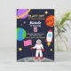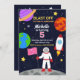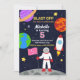 It is time to blast off and celebrate her birthday! An astronaut on the moon in outer space surrounded by planets, rocket ship, and stars all in bright, fun colours for any age. Pink flag to highlight age or perhaps name.