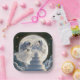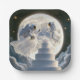 Two astronauts, one in a wedding dress, float near a large tiered cake with the full moon as the backdrop