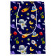 A vibrant space theme with astronaut, space aliens, asteroids and assorted space objects.