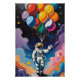 An astronaut, walking in the vastness of space, waves cheerfully while attached to a bunch of vibrant, colourful balloons. The backdrop bursts with a kaleidoscope of celestial hues, adding a whimsical contrast to the serene expanse of the universe.