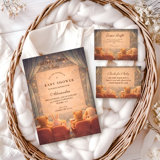 Set the scene for a cozy, cinematic celebration with this movie-themed baby shower design. Inspired by a warm home-theater night, the artwork features glowing string lights, classic popcorn tubs, soft blankets, and a nostalgic film-screen centerpiece that instantly creates a relaxed, intimate atmosphere.