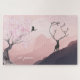 This "at peace" puzzle features a spring Japanese style mountain landscape with a pink sunrise, a beautiful pink flowering tree. There is a crane taking off from a tree branch ready to fly across the face of the moon and a deer standing in the foreground with antlers that are tree branches with spring buds. ^
