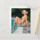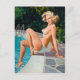 Classic PinUp card showing a nice blonde PinUp Girl in a white bikini testing the water in the pool, painted by Arthur Sarnoff (1912-2000)
