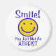 Put a human face on Atheism with a bright yellow face outlined in blue with blue letters that says: "Smile! You just met an ATHEIST."