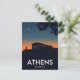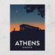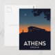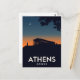 Capture the historical majesty of Athens, Greece, with this dramatic retro-style postcard. The design features the iconic Parthenon atop the Acropolis silhouetted against a deep twilight sky, with an orange glow on the horizon and a crescent moon overhead. This artwork beautifully conveys the ancient history and profound atmosphere of the Greek capital, making it a perfect piece for history enthusiasts and collectors of striking European travel posters.