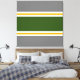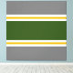 This sporty, vibrant design features a wide forest green centre stripe adjoined by slim white and golden yellow racing stripes. The outer stripes are medium grey.