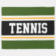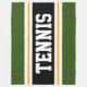 This sporty, athletic design features bold TENNIS text inside a highlighted wide black stripe with double white and yellow racing stripes against forest green outer stripes. The text can be personalised.