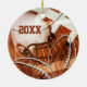 This sporty football themed ceramic ornament for an athlete or fan features a unique football graphics composite that includes helmet, minimalistic footballs, goal post and gridiron graphics overlying and blended with a football texture appearance - customise with player's or fan's name and monogram on the front and commemorative year on the back - by katz_d_zynes