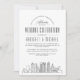 It features a modern deco-style illustration of the city's skyline resting towards the bottom. Centred above this are the names of the wedding couple and your wedding day information in matching open-lined style text. This is presented in a neutral black and white, classic colour theme.