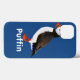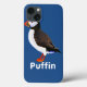A digital painting of an Atlantic Puffin. Text reading "Puffin" also appears. The Atlantic Puffin (Fratercula arctica) feeds primarily by diving in the water. They breed in large colonies on coastal cliffs or offshore islands in the North Atlantic. They shed the colourful outer parts of their bills after the breeding season, leaving a smaller and duller beak. Their short wings are adapted for swimming with a flying technique under water. In the air, they beat their wings rapidly (up to 400 times per minute) in swift flight, often flying low over the ocean's surface.