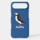 A digital painting of an Atlantic Puffin. Text reading "Puffin" also appears. The Atlantic Puffin (Fratercula arctica) feeds primarily by diving in the water. They breed in large colonies on coastal cliffs or offshore islands in the North Atlantic. They shed the colourful outer parts of their bills after the breeding season, leaving a smaller and duller beak. Their short wings are adapted for swimming with a flying technique under water. In the air, they beat their wings rapidly (up to 400 times per minute) in swift flight, often flying low over the ocean's surface.