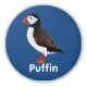 A digital painting of an Atlantic Puffin with text reading "Puffin" on a blue background. The Atlantic Puffin (Fratercula arctica) feeds primarily by diving in the water. They breed in large colonies on coastal cliffs or offshore islands in the North Atlantic. Puffins shed the colourful outer parts of their bills after the breeding season, leaving a smaller and duller beak. Their short wings are adapted for swimming with a flying technique under water. In the air, they beat their wings rapidly (up to 400 times per minute) in swift flight, often flying low over the ocean's surface.
