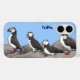 Puffins at rest on the rocks. Customisable text reading "Puffins" also appears. The Atlantic Puffin (Fratercula arctica) feeds primarily by diving in the water. They breed in large colonies on coastal cliffs or offshore islands in the North Atlantic. Puffins shed the colourful outer parts of their bills after the breeding season, leaving a smaller and duller beak. Their short wings are adapted for swimming with a flying technique under water. In the air, they beat their wings rapidly (up to 400 times per minute) in swift flight, often flying low over the ocean's surface.