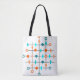 This tote bag has mid-century modern design of a grid in black lines with orange and teal circles and diamonds.