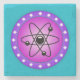 Science themed image. A circular shaped image with the symbol of the atom inside. A pink background contrasts brightly with the black symbol. A purple border with white stars circles around the illustration. A cool image for geeks and science buffs.
