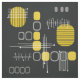 A mid century modern abstract art design that would have fit right in during the 1950s. Various shapes of oval circles and lines in yellow and grey against a black background.