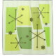 This 1950s midcentury modern vintage abstract art has wonky geometric rectangles with lines that make sputnik starbursts. Colours are shades of light yellow-green.