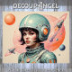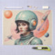 A stylish depiction of a woman in a sleek space suit and helmet, set against a pink background. The design embodies the Atomic Age aesthetic, blending retro-futuristic elements with mid-century modern influences. Rockets and abstract celestial motifs enhance the sense of optimism and exploration, reflecting the era’s fascination with space travel.
