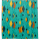 This shower curtain has a mid-century modern atomic design of diamonds, and starbursts on a field of turquoise.