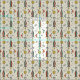 My original vector illustration of Retro Atomic Kitty Rockets, satellites, moons, atoms, starbursts, galaxies, pulsars, sound waves, and shooting stars, in gold, aquamarine, dark orange, black and off white.