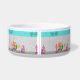 You are invited to the social event of the year with this Atomic Palm Springs Stewardess Party ceramic pet bowl design. Join these three vintage flight attendants from rivaling airlines as they check into their kitschy 1960s breezy block hotel. One of the fabulously hunky bellhops in a retro hot pink uniform holds the orange door while the other struggles with the women's luggage. Teal palm trees sway in the background of the impossibly turquoise sky as a jetliner flies overhead. This design will have you saying, “On your mark, jet set, go!”