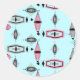 These retro Atomic Pink and Grey Pattern Round Stickers are so awesome they will have you saying, “I can’t believe it’s not barkcloth!” The vintage inspired design is a new take on mid century modern styles. It offers all of the fun of finding a vintage product without having to schlep through antique stores and flea markets. Just when you think it can’t get more perfect, you learn that this whimsical design with its kitschy off kilter shapes in colours of pink, charcoal grey, black, and light grey even offers the option of customising the background colour. We’ve put it on a lovely shade of aqua, but a quick change of the background colour, and… Presto! Change-o! The product has gone from subdued to daring! There are dots, starbursts, and diamonds in this piece of modern art. This homage to the 1950s will thrill your retro loving soul.