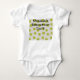 This baby bodysuit has a mid-century modern design of tan arches repeating on white as a background with repeating green-gold circles with darker green-gold starbursts inside them.