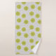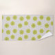 This towel set has a white washcloth, a green-gold hand towel, and a bath towel with a mid-century modern design of tan arches repeating on white as a background with repeating green-gold circles with darker green-gold starbursts inside them.
