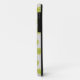 This phone case has a mid-century modern design of tan arches repeating on white as a background with repeating green-gold circles with darker green-gold starbursts inside them.