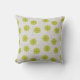 This throw pillow has a mid-century modern design of tan arches repeating on white as a background with repeating green-gold circles with darker green-gold starbursts inside them.