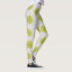 These leggings have a mid-century modern design of tan arches repeating on white as a background with repeating green-gold circles with darker green-gold starbursts inside them.
