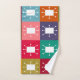 This towel set has a mid-century modern design of squares with rounded rectangles with antenna in mid-century modern colours. Want the same design in different colours? Message me.