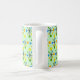 This mug is covered with a mid-century modern design of atomic starbursts on a green background.