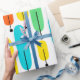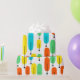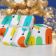 This rapping paper has a mid-century modern design of long ovals in yellow, orange, green, and turquoise with black lines with circles on the ends.