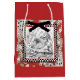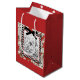 Medium red glossy gift bag with a vintage black and white Alice in Wonderland image, on the front, of Alice under attack by the Cards in a black and white chequerboard frame on a background of playing cards on red. Optional black bow. See matching large gift bag. See the entire Wonderland Gift Bag collection in the PARTY FAVORS section.
