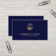 Simple minimalist lawyer attorney at law navy blue and gold business card with scales of justice logo, QR code, and modern typography. Suitable for a law firm, professional legal practitioner, judge, solicitor, or consultant.
