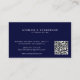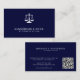 Simple minimalist lawyer attorney at law navy blue business card with scales of justice logo, QR code, and modern typography. Suitable for a law firm, professional legal practitioner, judge, solicitor, or consultant.