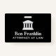 Attorney at law personalised court house name Badge. Custom name badges for barrister, corporate lawyer, clerk, manager, legal counsel, judge, assistant, professor, advisor, secretary, coworker, colleague, solicitor, mediator, litigation attorney, notary etc. Professional template with title or company name. Make your own with a custom name and formal job function. Elegant modern typography design with black and white court house logo. Useful for office employee, coworkers, colleagues, receptionist, pharmacy, personnel, staff members etc. Add your own logo optionally. Background colour can be changed.