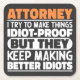 Funny Attorney Sayings "Attorney I Try To Make Things Idiot Proof But They Keep Making Better Idiots". Grab this Funny Attorney design as a funny gifts for an awesome mum, dad or friend.