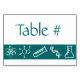 This table card features an accent band in deep teal with a science-themed pattern of planetary model atoms, DNA strands, test tubes, beakers, and caffeine molecules decorating it. Plenty of space is left above the band so you can fill in your guests' names or the table number, so that seating can go more smoothly at your geeky event.
